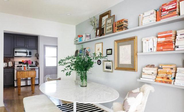 AliceEve_HH5A petite, elevated porch offers a cushioned banquette, and the light-filled living room benefits from coved ceilings, a vintage brick fireplace and a gigantic bay window. The adjoining dining room does double duty as a library. The kitchen has updated appliances and outdated terra cotta-colored granite countertops on ordinary, dove-gray raised-panel cabinetry.