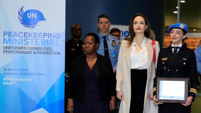 Actor and UNHCR Special Envoy Angelina Jolie (C) poses for a picture next to Lieutenant Commander Marcia Andrade Braga, United Nations Military Gender Advocate of the Year (C-R) and Assistant-Secretary General for Africa Bintou Keita, (C-L) as she arrives to address a ministerial meeting on peacekeeping at U.N. headquarters in New York, U.S., March 29, 2019. REUTERS/Eduardo Munoz