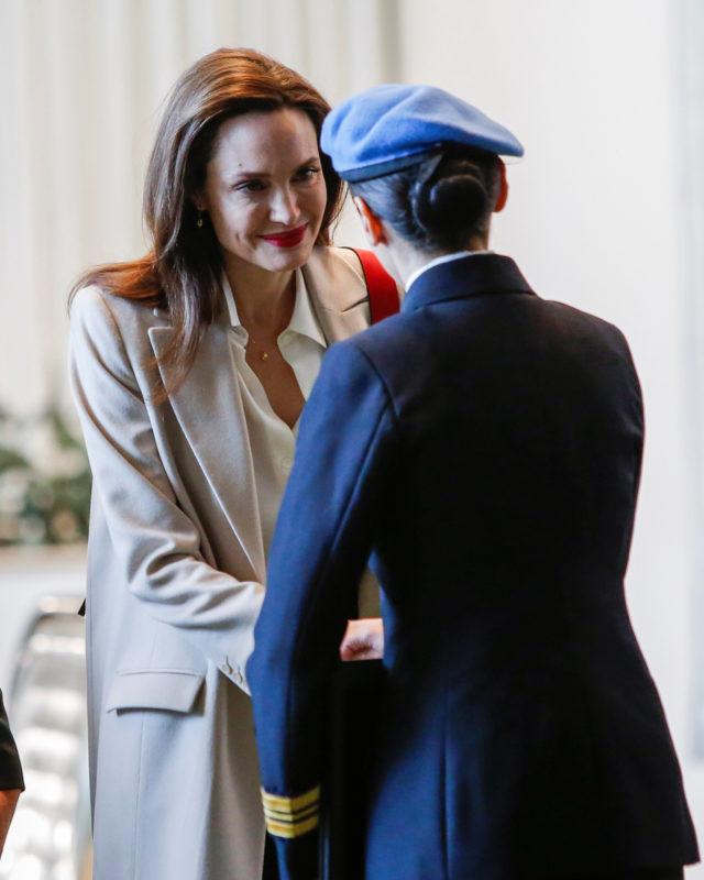 UNHCR Special Envoy Angelina Jolie shakes hands with Lieutenant Commander