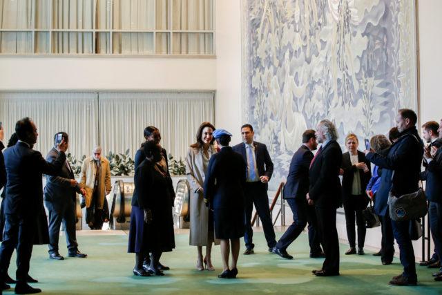 Actor and UNHCR Special Envoy Angelina Jolie (C) shakes hands with Lieutenant Commander Marcia Andrade Braga, United Nations Military Gender Advocate of the Year (C-R) as she arrives to address a ministerial meeting on peacekeeping at U.N. headquarters in New York, U.S., March 29, 2019. REUTERS/Eduardo Munoz
