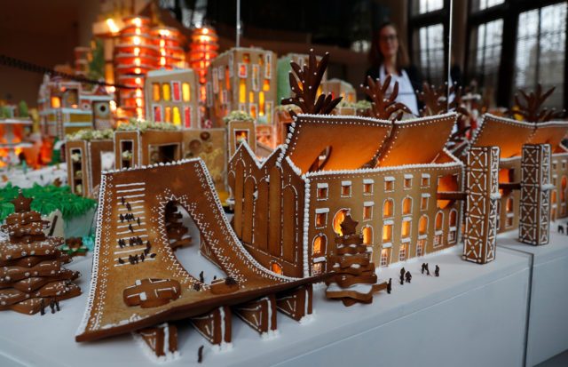 A staff member at the poses for a photograph next to a design called Temporal Pleasure by architects, Spaced Out and Evolution Design at the Museum of Architecture’s Gingerbread City at the V&A Museum, in London, Britain, December 5, 2018. REUTERS/Peter Nicholls