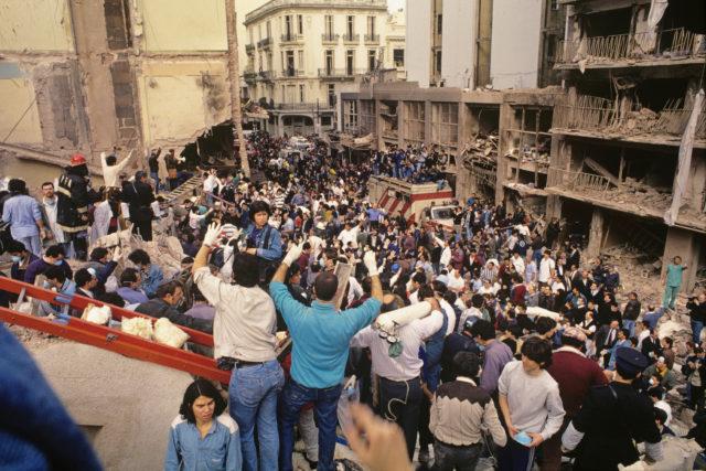 Rescue personnel work after an explosives-laden truck blew up outside the Argentine Israeli Mutual Association (AMIA) building on July 18 1994, in Buenos Aires, Argentina. Julio Menajovsky/Handout via REUTERS