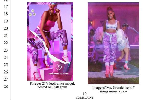 A picture of a model on the Instagram account of fashion retailer Forever 21 is seen alongside an image of pop star Ariana Grande in a screenshot of a legal complaint filed in U.S. District Court in Los Angeles, California, U.S., obtained on September 3, 2019. Court Filing from PACER (U.S. Dist. Court C.D. Cal.) via REUTERS NO RESALES. NO ARCHIVES. THIS IMAGE HAS BEEN SUPPLIED BY A THIRD PARTY.