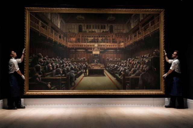 FILE PHOTO: Sotheby’s staff pose for a photograph with Banksy’s ‘Devolved Parliament’ which has an estimated value of 1.5-2 million British pounds in a forthcoming sale in London, Britain September 27, 2019. REUTERS/Simon Dawson