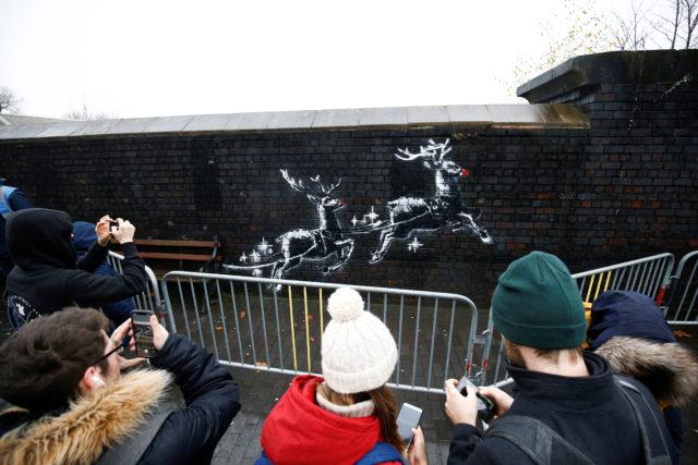 People gather round a new mural by the street artist Banksy in Birmingham, Britain, December 10, 2019. REUTERS/Henry Nicholls
