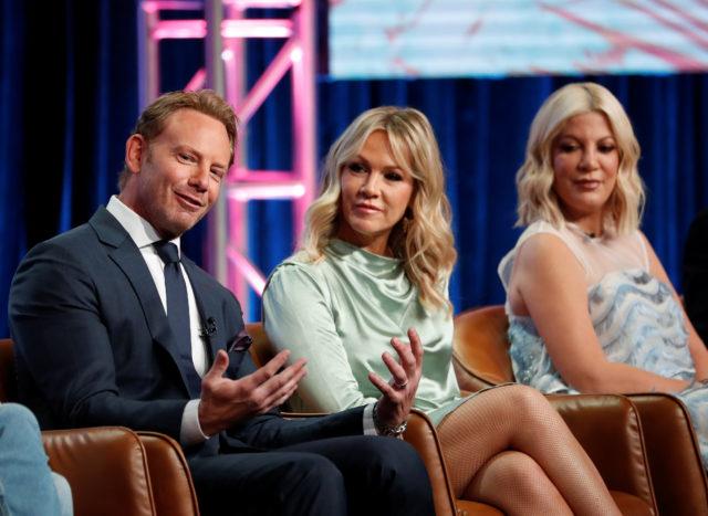 Cast member Ian Ziering speaks next to Jennie Garth and Tori Spelling during a panel for the Fox television series “BH90210” during the Summer TCA (Television Critics Association) Press Tour in Beverly Hills, California, U.S., August 7, 2019. REUTERS/Mario Anzuoni