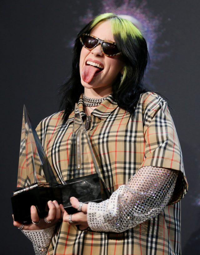 FILE PHOTO: Billie Eilish poses backstage with her awards for New Artist of the Year and Favorite Artist, Alternative Rock, at the.2019 American Music Awards, Los Angeles, California, U.S., November 24, 2019 – REUTERS/Danny Moloshok/File Photo