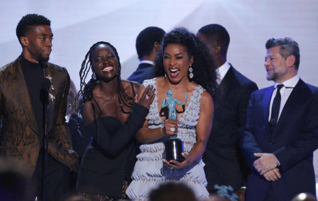 25th Screen Actors Guild Awards – Show – Los Angeles, California, U.S., January 27, 2019 – Cast member Angela Bassett celebrates with cast member Lupita Nyong’o after the Black Panther film won Outstanding Performance by a Cast in a Motion Picture. REUTERS/Mike Blake