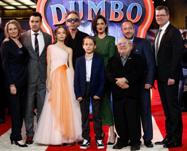Producer Katterli Frauenfelder, actor Colin Farrell, actor Nico Parker, director Tim Burton, actor Finley Hobbins, actor Eva Green, actor Danny DeVito, producers Derek Frey and Justin Springer attend the European premiere of “Dumbo” movie in London, Britain March 21, 2019. REUTERS/Henry Nicholls