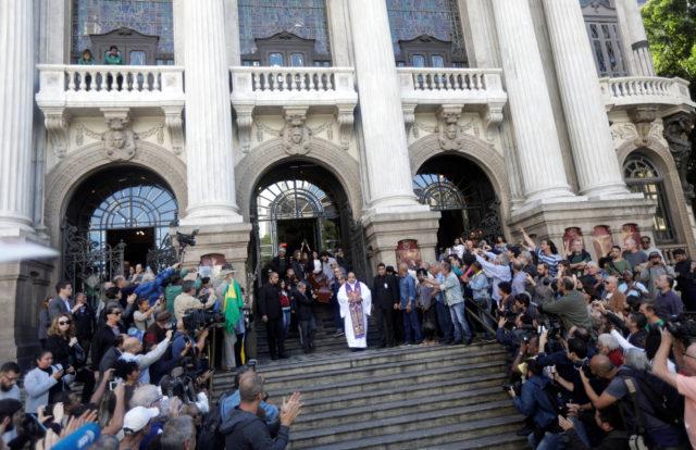 People carry the coffin of Brazilian singer Joao Gilberto during his wake in Rio de Janeiro’s Municipal Theater, Brazil July 8, 2019. REUTERS/Ricardo Moraes