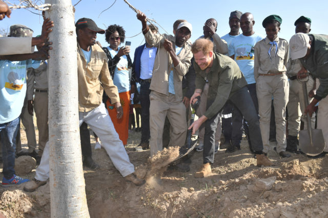 Britain’s Prince Harry, Duke of Sussex, helps to plant a tree at the Chobe National Park, on day four of the royal tour of Africa, in Botswana September 26, 2019. Dominic Lipinski/Pool via REUTERS