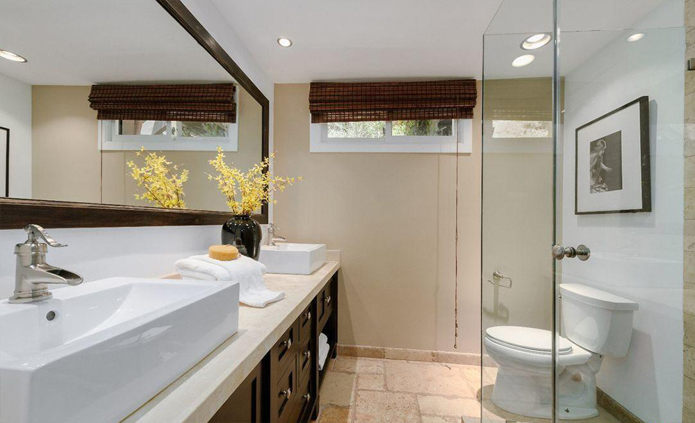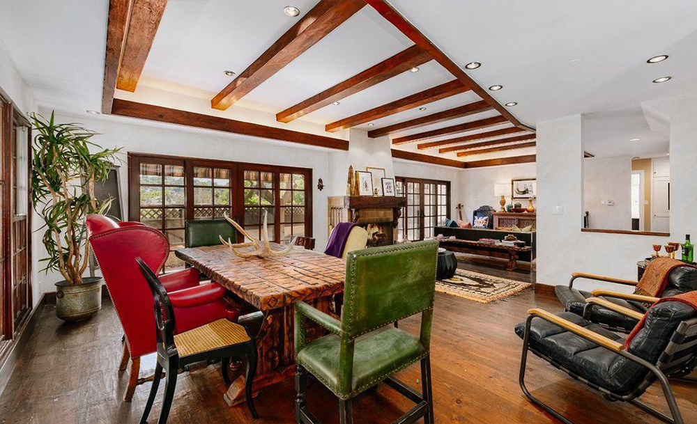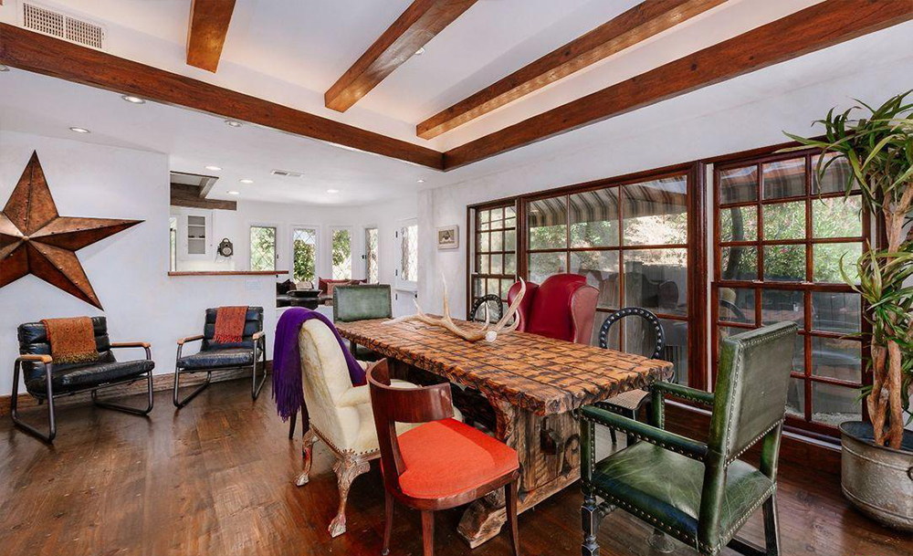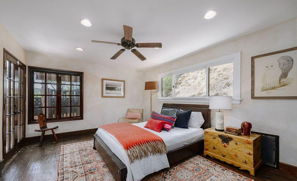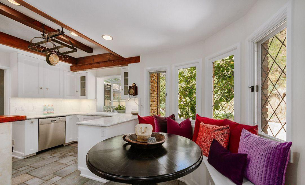 hillside behind the house and the humbly sized, marble-countered kitchen has top-end appliances, a charming built-in breakfast banquette, and, over the center of the kitchen’s workspace where it could easily ensnare a well-teased weave, a wrought iron pot rack.