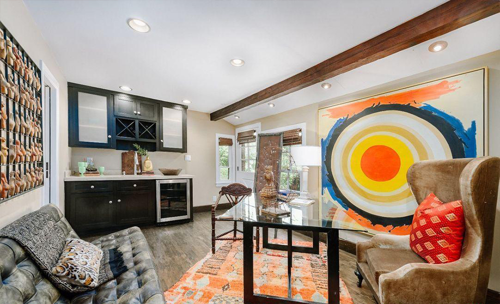 Two guest bedrooms have access to a pair of renovated bathrooms and a third potential guest bedroom is done up as an office and conveniently equipped with a wet bar. The sprawling, entertainment industry icon worthy master suite encompasses a bedroom area with a white-painted