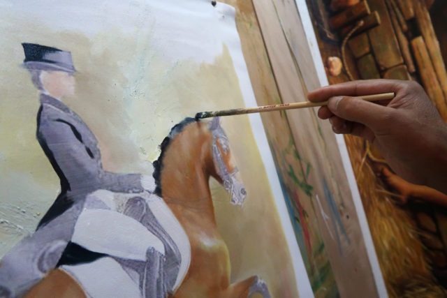 Artist Ren Lijiang paints over an image printed on a canvas at his studio in Dafen Oil Painting Village in Shenzhen, Guangdong province, China December 5, 2018. REUTERS/Thomas Suen