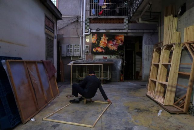 A man makes wooden frames in Dafen Oil Painting Village in Shenzhen, Guangdong province, China December 6, 2018. REUTERS/Thomas Suen