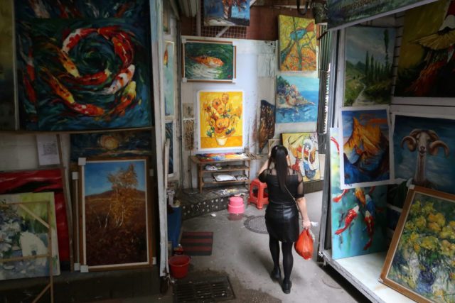 A woman walks through an alley surrounded by paintings on walls at Dafen Oil Painting Village in Shenzhen, Guangdong province, China December 5, 2018. REUTERS/Thomas Suen