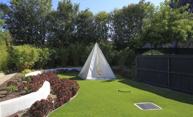 A double-height living room replete with fireplace and a two-story wall of windows is overlooked by a second floor lounge while a more intimate ground floor sitting room spills out to a broad terrace and faux-grassed yard decked out with a small tent for hiding out and quiet meditations.