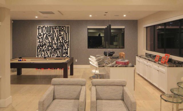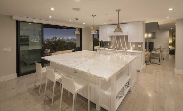 DemiLovato_LCLSE6Fitted with marble countertops and shimmering stainless steel backsplashes, the high-end kitchen is arranged around a double wide island and opens to an informal dining area and TV lounge that, in turn, connects through a floor-to-ceiling wall of disappearing glass sliders to the resort-style yard. Guest bedrooms are all en suite and sprinkled throughout the house for maximum privacy and the master includes a private sitting area and two walk-in closets while the entire third floor is given over to a sprawling “club level” entertainment space with professional bar, billiard area, media lounge and large terrace with knee-buckling views of the downtown skyline.