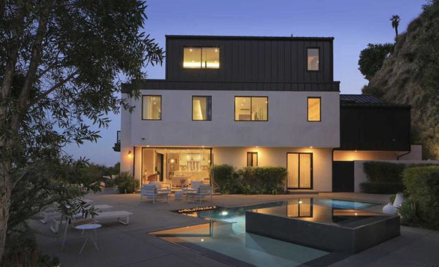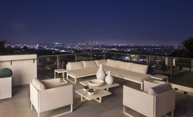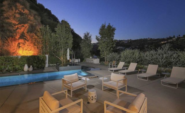 DemiLovato_LCLSE4Outside the kitchen and TV lounge, a linear fire feature runs alongside a snazzy, zero edge swimming pool and spa surrounded by a large terrace with outdoor kitchen and a lighted path leads to a TV-equipped gazebo perched on a private promontory that practically hangs over Laurel Canyon.