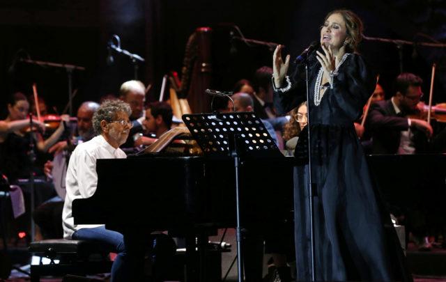 Yasmina Joumblatt, the granddaughter of the legendary singer Asmahan, and Gabriel Yared, a Lebanese composer, perform during the Beitiddine Art Festival in Beiteddine, Lebanon July 18, 2019. REUTERS/Mohamed Azakir