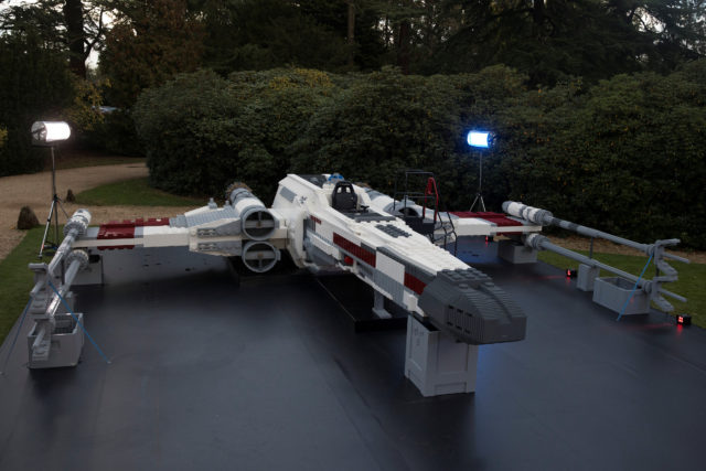 A X-Wing Lego model sits on display at the announcement