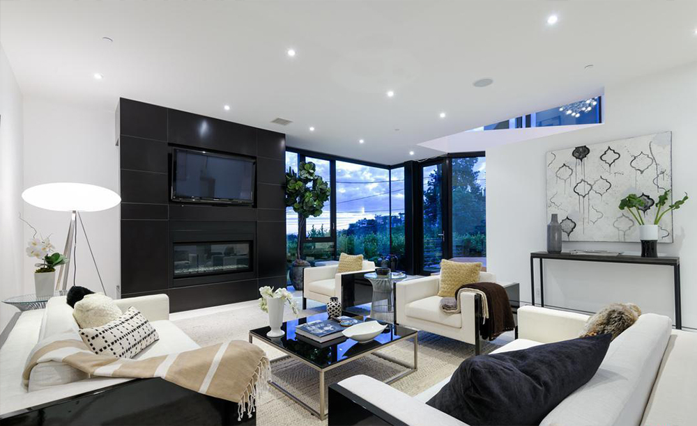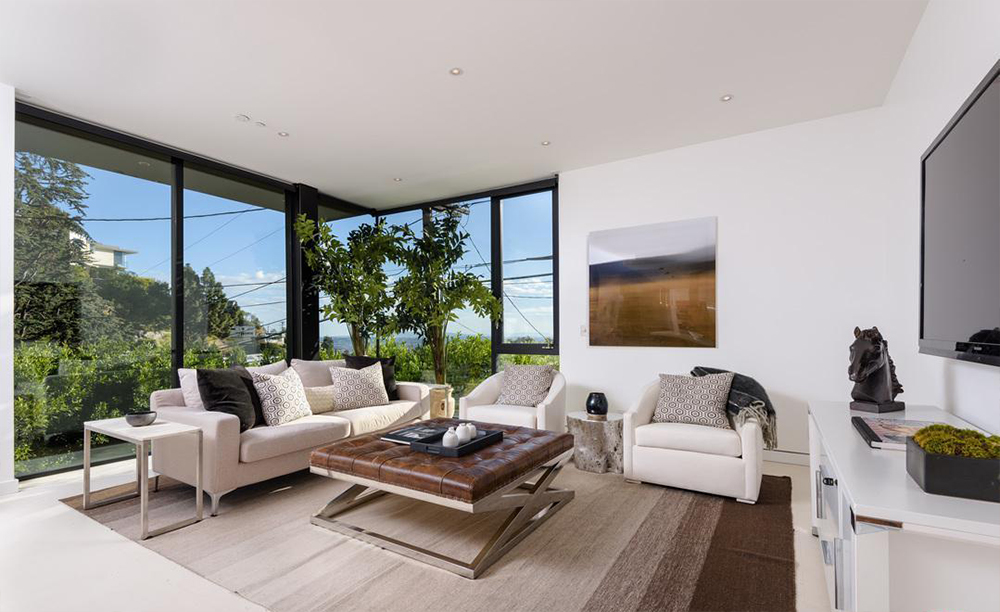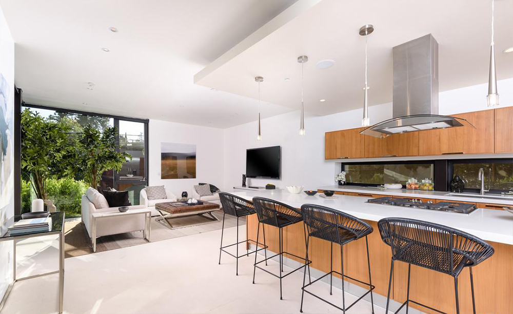 Main floor living spaces spoke off a glass-walled foyer that features a muscular steel-and-wood open-tread floating staircase. The living room has a TV-surmounted fireplace; there’s a separate dining room; and the center-island kitchen opens to a family room with floor-to-ceiling windows that provide a city-lights view — albeit one marred by a telephone pole and thick tangle of telephone wires.