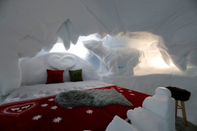 A hotel room made from snow and ice is pictured inside an igloo, know as an “ice room” at the Rifugio Capanna Presena, located 2,700 metres above sea level on the Presena glacier, in Passo del Tonale, Italy, January 9, 2020. Picture taken January 9, 2020. REUTERS/Yara Nardi