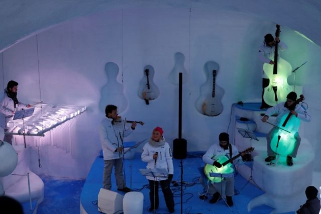 Musicians play instruments made from ice during a performance at the Ice Music Festival in an igloo at 2,600 metres above sea level on the Presena Glacier, in Passo Paradiso, Italy, January 9, 2020. Picture taken January 9, 2020. REUTERS/Yara Nardi