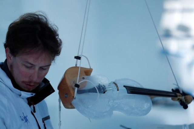 A violin made from ice is displayed at the Ice Music Festival in an igloo at 2,600 metres above sea level on the Presena glacier, in Passo Paradiso, Italy, January 9, 2020. REUTERS/Yara Nardi