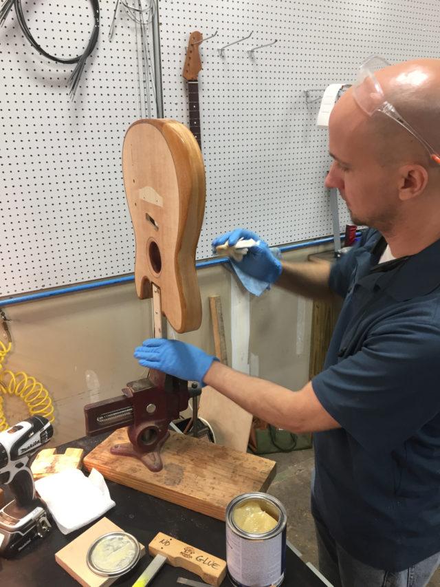 Handout photo Fender Musical Instruments Corp’s Josh Hurst rubs a