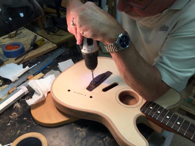Fender Musical Instruments Corporation’s Tim Shaw drills a bridge in one of the company’s new American Acoustasonic Series Telecaster guitars in Corona, California, U.S., in this photo provided January 18, 2019. Fender Musical Instruments Corp/Handout via REUTERS