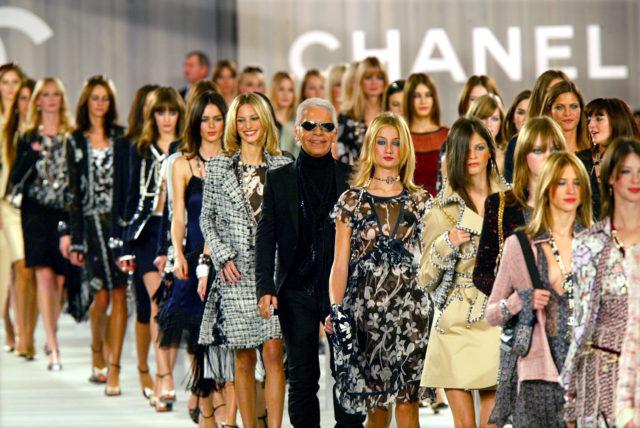 FILE PHOTO: Chanel designer Karl Lagerfeld appears with models at end of his spring-summer ready-to-wear fashion show in Paris, France October 10, 2003. REUTERS/Charles Platiau/File Photo