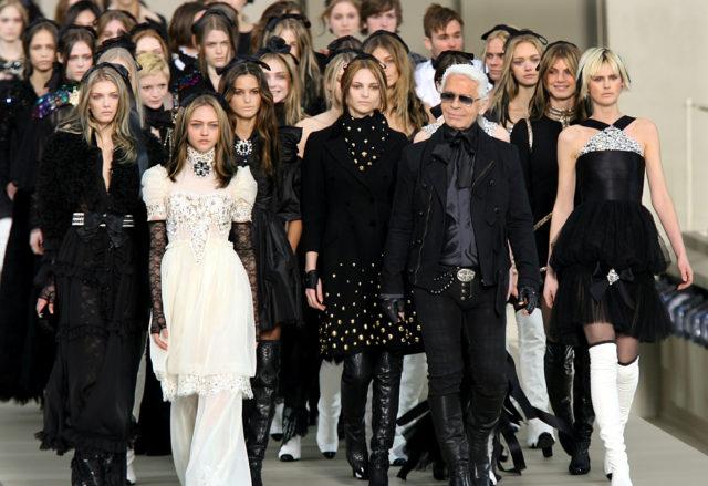 FILE PHOTO: German designer Karl Lagerfeld (front 2nd R) leads models as they appear on the catwalk at the end of the Fall/Winter 2006/2007 ready-to-wear’s Chanel collection in Paris, France March 3, 2006. REUTERS/Charles Platiau/File Photo