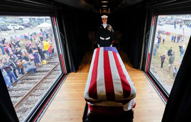 The flag-draped casket of former President George H.W. Bush passes through Magnolia, Texas, Thursday, Dec. 6, 2018, along the route from Spring to College Station, Texas. David J. Phillip/Pool via REUTERS