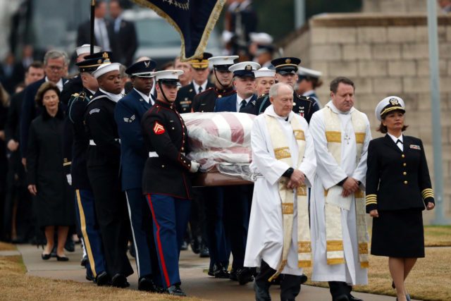 The flag-draped casket of former President George H.W. Bush is carried by a joint services military honor guard followed by family members at the George H.W. Bush Presidential Library and Museum Thursday, Dec. 6, 2018, in College Station, Texas. Matt York/Pool via REUTERS