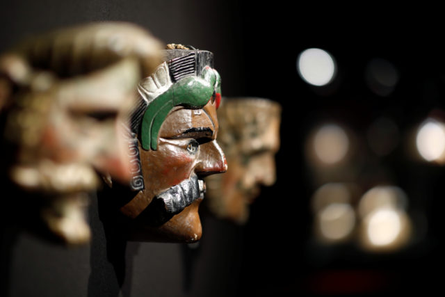 A spanish mask with moustache, one of pre-Columbian artefacts, is presented to the press at Drouot auction house in Paris, France, September 18, 2019. REUTERS/Benoit Tessier