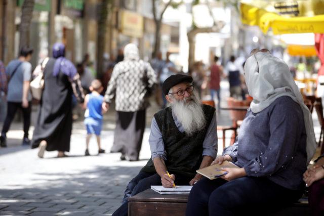 Michael Netzer, an American comics artist formerly named Mike Nasser, sketches Endy Jber, 24, a conservative Muslim woman from the Israeli Arab village of Abu-Ghosh, on a bench in Jerusalem June 12, 2019. Picture taken June 12, 2019. REUTERS/Ronen Zvulun