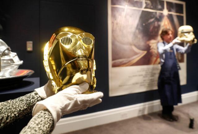 A Sotheby’s employee holds a “Return of the Jedi” promotional C-3PO Helmet 1983, estimated at £15,000-£25,000 created by George Lucas’ visual effects company during a photocall at Sotheby’s in London, Britain December 6, 2019. REUTERS/Thomas Mukoya