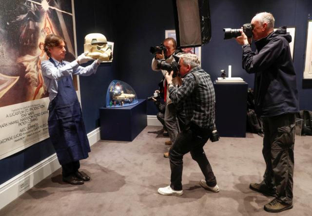 A Sotheby’s employee poses for photographers with a prototype of an Imperial Stormtrooper helmet 1976, estimated at £30,000-£60,000 created for the first “Star Wars” film during a photocall at Sotheby’s in London, Britain December 6, 2019. REUTERS/Thomas Mukoya