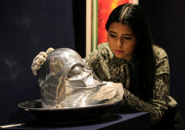 A Sotheby’s employee poses with a “Bring me the Head of Darth Vader” by Clive Barker, 1999 estimated at £6,000-£9,000 during a photocall at Sotheby’s in London, Britain December 6, 2019. REUTERS/Thomas Mukoya