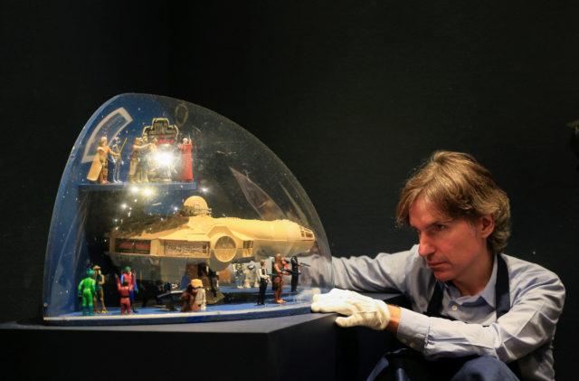 A Sotheby’s employee poses with a “The Empire Strikes Back” Toy figures and aMillenium Falcon toy shop display from 1980 estimated at £7,000-£10,000 during a photocall at Sotheby’s in London, Britain December 6, 2019. REUTERS/Thomas Mukoya