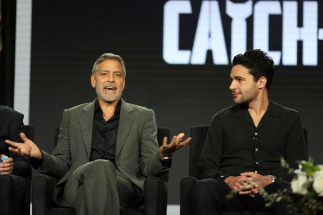 Actor, executive producer, and director George Clooney (L) and actor Christopher Abbott speak on a panel for the Hulu series “Catch-22”, during the Television Critics Association (TCA) Winter Press Tour in Pasadena, California, U.S., February 11, 2019. REUTERS/Lucy Nicholson