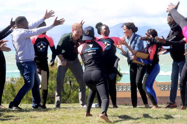Britain’s Prince Harry, Duke of Sussex and Meghan, Duchess of Sussex join surf mentors, as they visit Waves for Change, an NGO supporting local surf mentors to provide mental health services to vulnerable young people living in under resourced communities, at Monwabisi Beach, in Cape Town, South Africa September 24, 2019. Chris Jackson/Pool via REUTERS