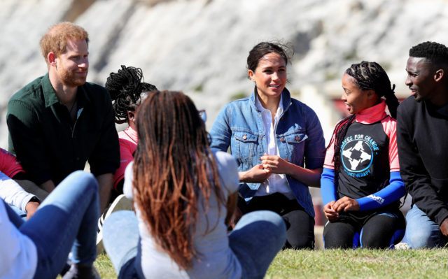 The Duke and Duchess of Sussex, Prince Harry and his wife Meghan, meet with members of the NGO Waves for Change, during their African tour, on Monwabisi Beach in Cape Town, South Africa, September 24, 2019. REUTERS/Mike Hutchings