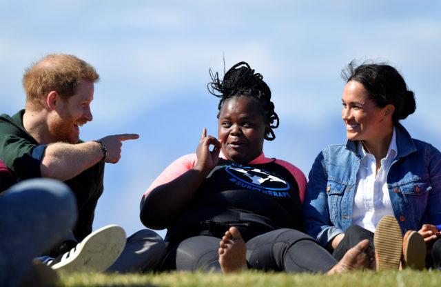 The Duke and Duchess of Sussex, Prince Harry and his wife Meghan, meet with members of the NGO Waves for Change, during their African tour, on Monwabisi Beach in Cape Town, South Africa, September 24, 2019. REUTERS/Toby Melville