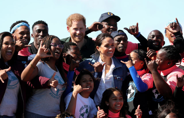 The Duke and Duchess of Sussex, Prince Harry and his wife Meghan, pose for a photo as they meet with members of the NGO Waves for Change, during their African tour, on Monwabisi Beach in Cape Town, South Africa, September 24, 2019. REUTERS/Sumaya Hisham