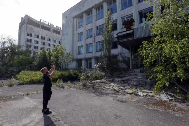 A visitor takes photos of a building in the abandoned city of Pripyat, near the Chernobyl nuclear power plant, Ukraine June 2, 2019. REUTERS/Valentyn Ogirenko