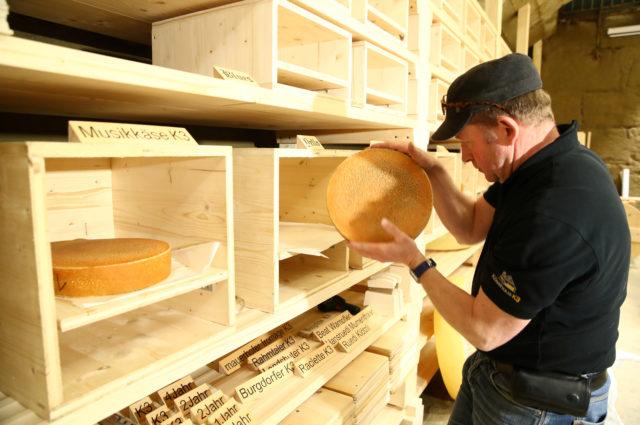 Wampfler, a cheese maker, checks his wheels of cheese in