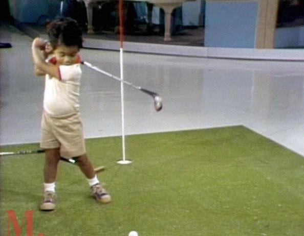 Two-year-old Tiger had a putting contest with comedian Bob Hope, another one of the show’s guests. After putting two shots past the cup, Tiger picked one up and placed it next to the cup.