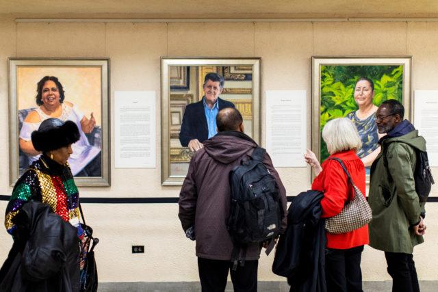 Visitors examine Betsy Ashton’s exhibition, Portraits of Immigrants, Unknown Faces,